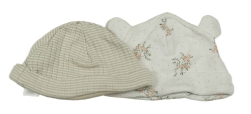 2x čepice - bílá s kvítky + béžová pruhovaná