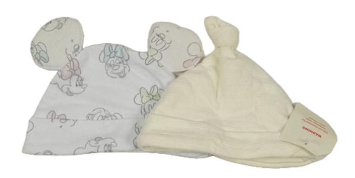 2x bavlněná čepice - bílá s Minnie + světležlutá pruhovaná