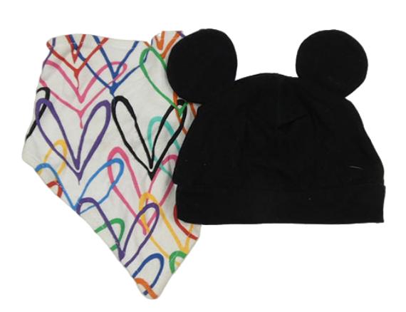 • 2set - Černá bavlněná čepice s oušky + bílo-barevný slinták se srdíčky