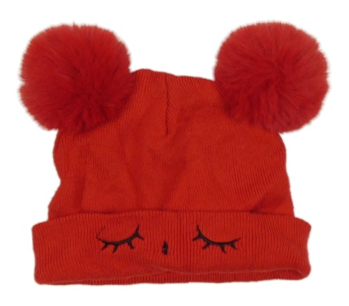 Červená pletená čepice s bambulkami