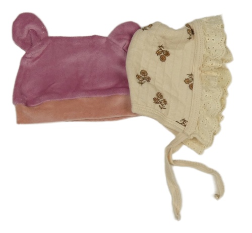 2x čepice - růžová plyšová + béžová s kytičkami a madeirou