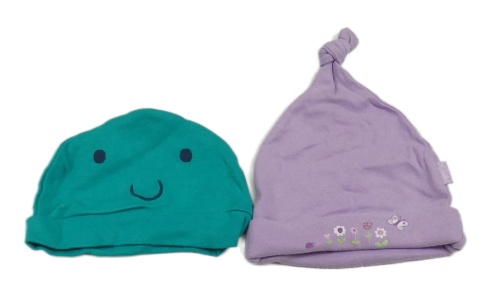 2x bavlněná čepice - tyrkysová s očima + lila s kytičkami