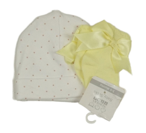 2 set - bílá puntíkatá bavlněná čepice + žluté ponožky s mašlí