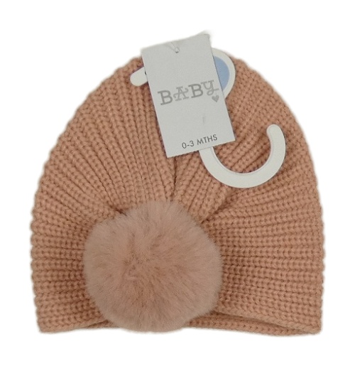 Nové - pudrová žebrovaná pletená turbanová čepice s bambulí Matalan
