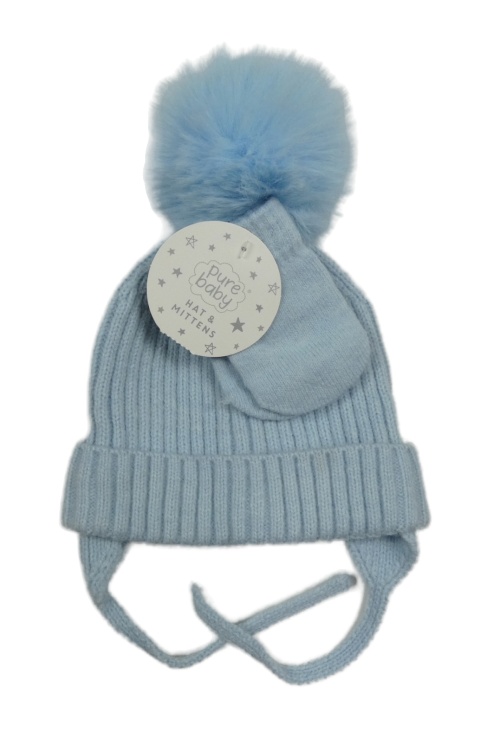 Nové - Světlemodrá pletená čepice s bambulí + rukavice Pure Baby