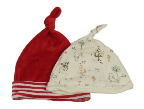 2x čepice - červená sametová + smetanová s oslíky