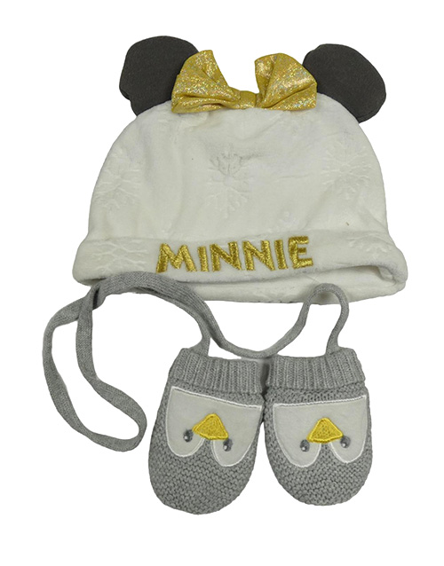 • 2set - Smetanová sametová čepice s oušky a mašlí - Minnie + šedé rukavice s tučňákem na šňůře