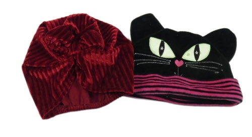 2x - Červená sametová žebrovaná turbanová čepice + černá sametová čepice s kočkou