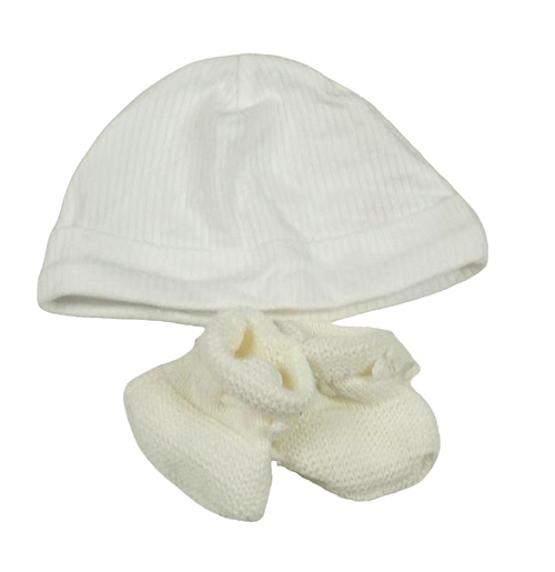 • 2set - Bílá pruhovaná bavlněná čepice + smetanové pletené capáčky