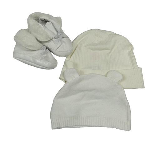 • 3set - Bílá pletená čepice s oušky + smetanová žebrovaná + bílé koženkové capáčky s kožešinou vel. 17