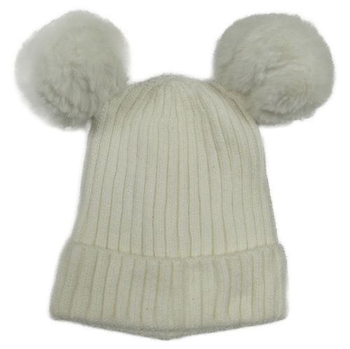 Bílá pletená žebrovaná podšitá čepice s bambulemi Tu