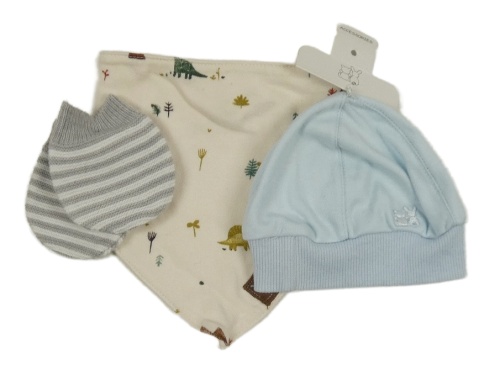• Nové - 3set - Světlemodrá bavlněná čepice + béžový slinták + pruhované pletené rukavice