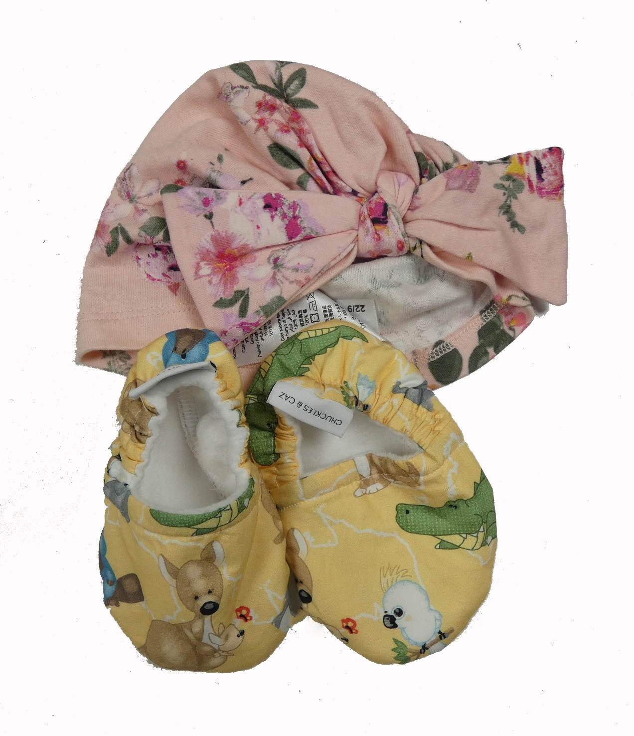 • 2set - Růžová květovaná bavlněná turbanová čepice s mašlí + žluté capáčky se zvířaty vel. 18