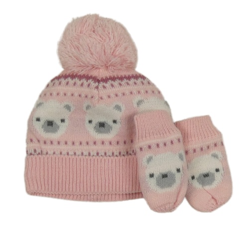 2set - Růžovo-bílá vzorovaná čepice s medvídky a bambulí + rukavice Nutmeg