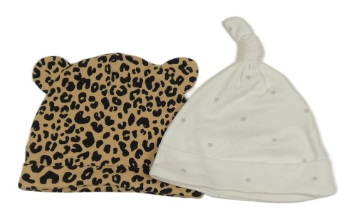 2x čepice - béžovo-černá leopardí + bílá s hvězdičkami