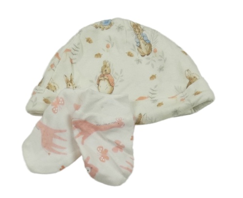 2Set - Smetanová čepice s králíčky - Peter Rabbit morrisons + bílé rukavice se zvířátky