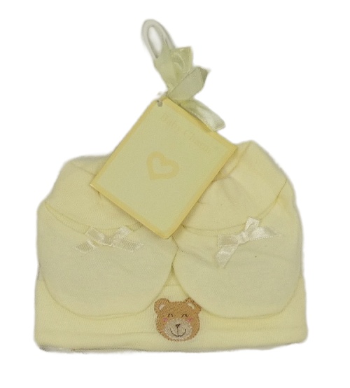 Nové - 2set - Žlutá bavlněná čepice s medvídkem + capáčky