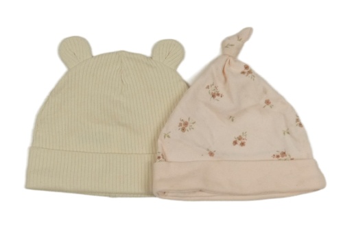 2x - Béžová žebrovaná + světlerůžová čepice s kytičkami