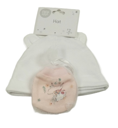 Nové - 2set - Bílá bavlněná čepice s oušky + růžové rukavičky s myškou