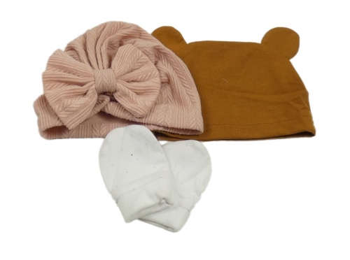 3set - 2x čepice - růžová+ medová + bílé rukavice