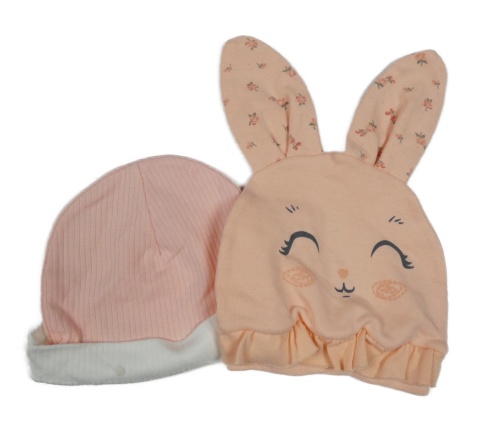 2x bavlněná čepice - růžovo-bílá žebrovaná s žirafou + s králíkem