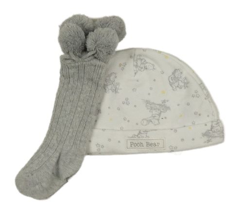 2set - Bílá čepice s medvídkem Pú + šedé ponožky s bambulkami