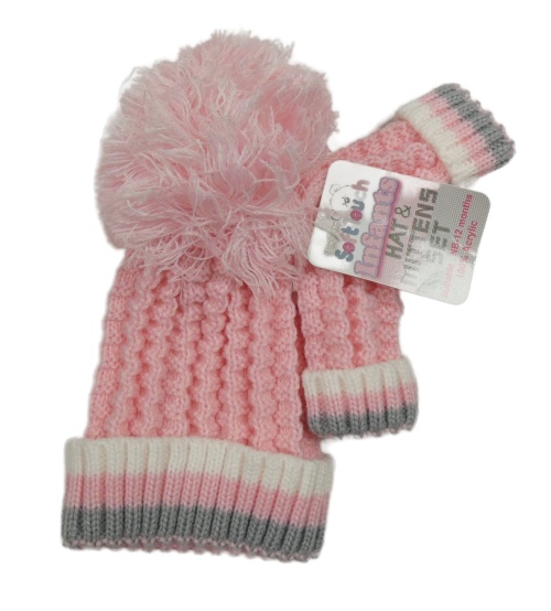 Nové - 2set - Světlerůžovo-šedá čepice s bambulí + rukavice