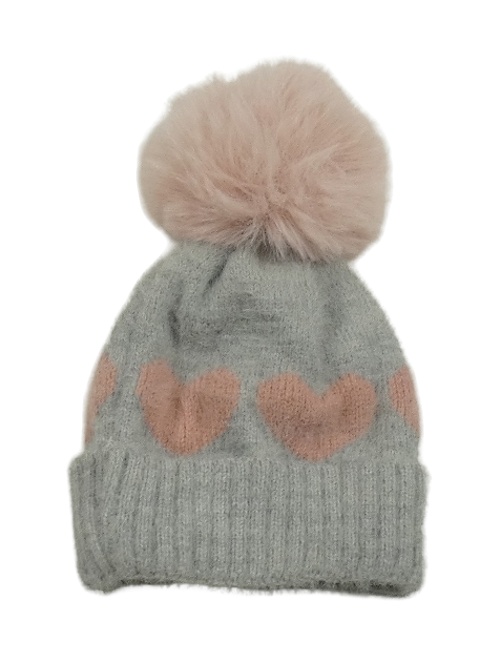 Šedo-růžová pletená čepice se srdíčky a bambulí
