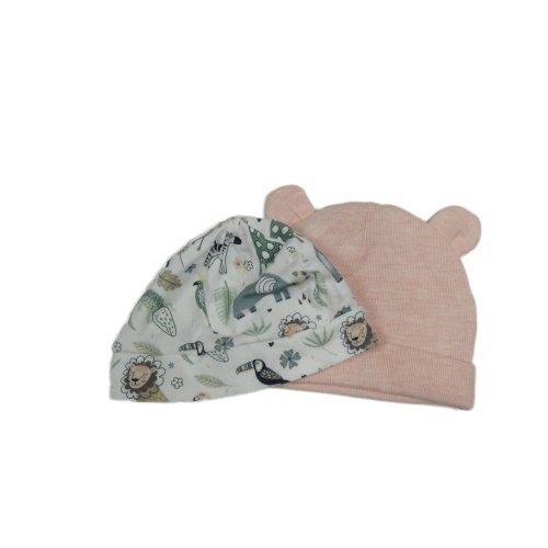 2x čepice - světlerůžová s hvězdou + bílá se zvířaty