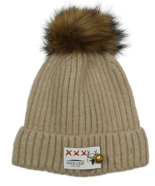 • Béžová žebrovaná pletená čepice s nášivkou s rolničkou a bambulí