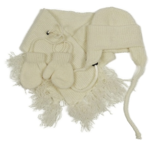 • 3Set - Smetanová žebrovaná zavazovací čepice + palcové rukavice se šňůrkou + šála s třásněmi