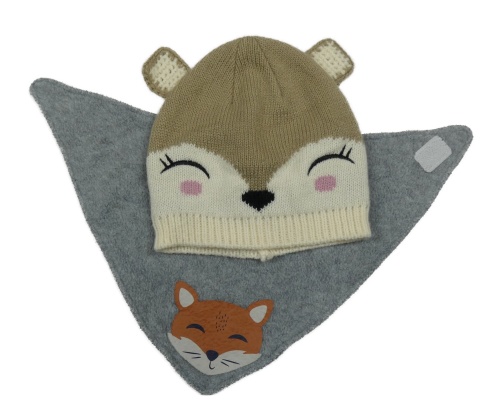 2Set - Hnědo-smetanová pletená čepice s čumáčkem MANOR + šedý melírovaný fleecový šátek/s s liškou Smile