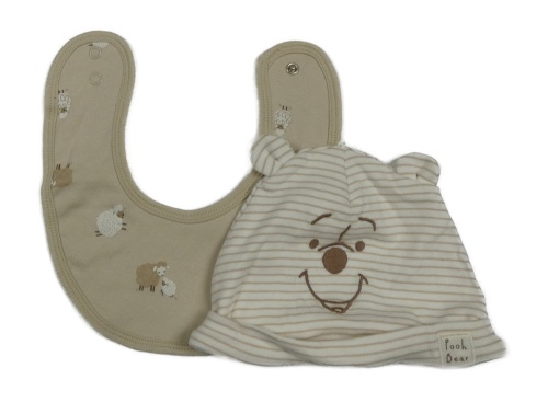 • 2Set - Bílo-hnědá pruhovaná čepice s Pú + béžový bryndák s ovečkami