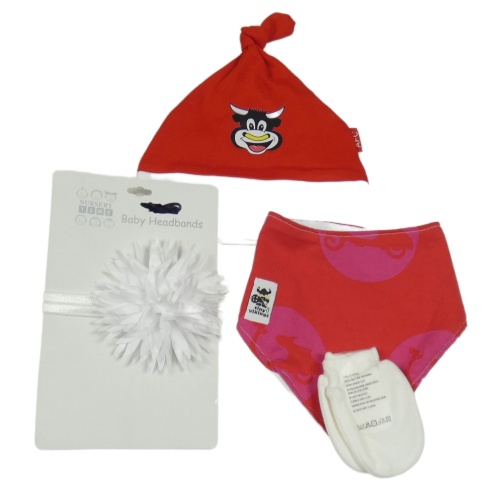 • 4set - Červená bavlněná čepice s býkem + slinták se skútry + smetanové rukavičky + bílá čelenka s květinou