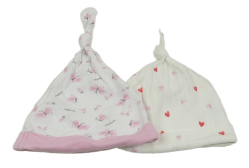 2x bavlněná čepice bílá se srdíčky+ bílá s motýlky
