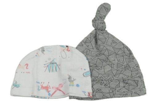 2x - Čepice - Bílá s cirkusovými zvířátky, šedá melírovaná s medvídky
