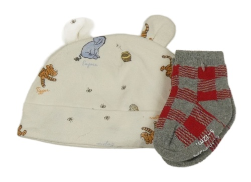 2Set - Smetanová čepice s Pú s kamarády a oušky Tu + šedo/červené kostkované teplé ponožky