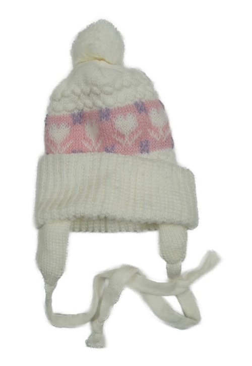 Smetanovo-růžová pletená zavazovací čepice s kytičkami a bambulí C&A