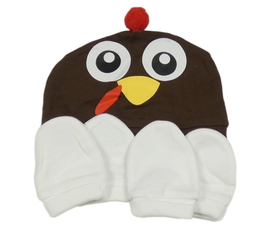 3set - Hnědá bavlněná čepice - slepice + 2x bílé rukavičky