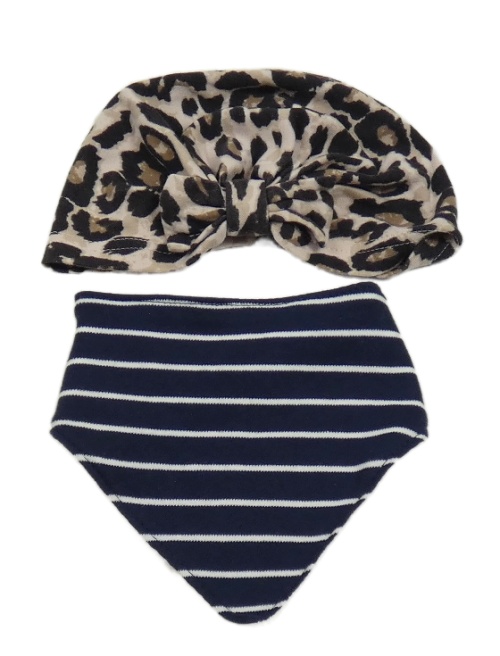 2 set - růžovo-hnědá turbanová čepice + tmavomodrý pruhovaný slinták
