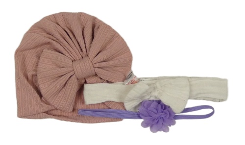3x - Růžová turbanová čepice + bílá čelenka + fialová čelenka