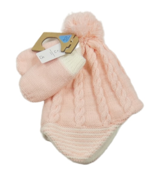 • Nové - 2 set - světlerůžová vzorovaná pletená podšitá čepice s bambulí + pletené rukavice Nutmeg
