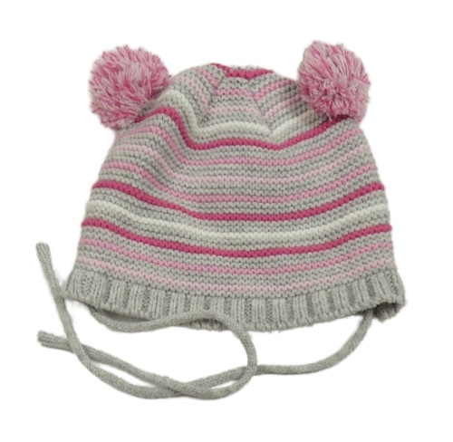 Šedo-růžová pruhovaná pletená čepice s bambulkami Ergee