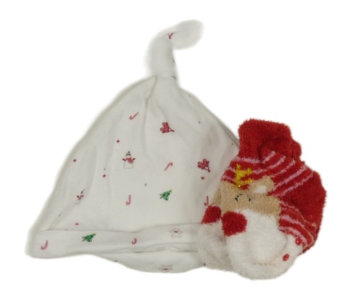 • 2set - Bílá bavlněná čepice se Santou + červené chlupaté ponožky se sobem