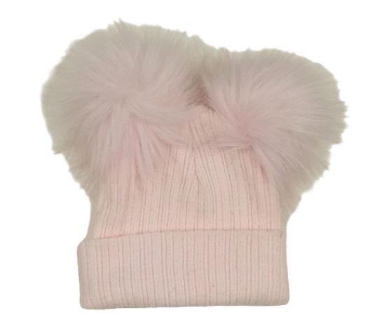 Růžová žebrovaná pletená čepice s bambulemi