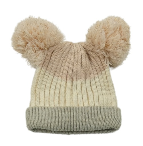 Smetanovo-světlerůžovo-béžová pletená žebrovaná čepice s bambulemi