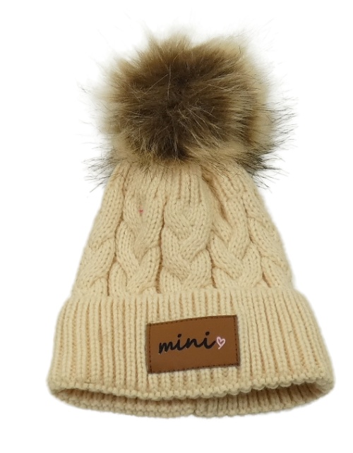 Pudrová vzorovaná pletená čepice s nášivkou a bambulí