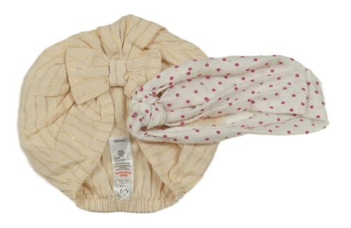 2 set - zlatá pruhovaná turbanová čepice + bílo-růžová puntíkatá čelenka