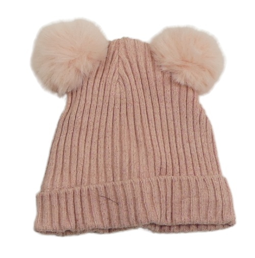Růžová třpytivá pletená podšitá čepice s bambulemi