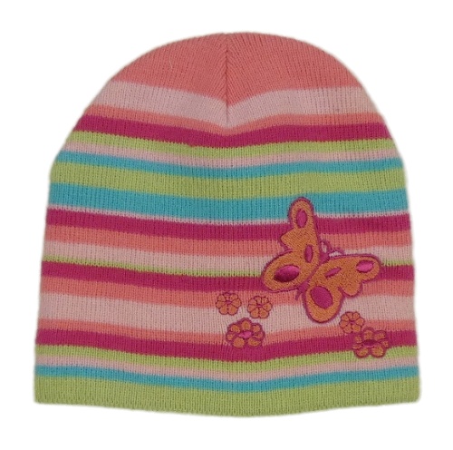Růžovo-zeleno-modrá pruhovaná pletená čepice s motýlky